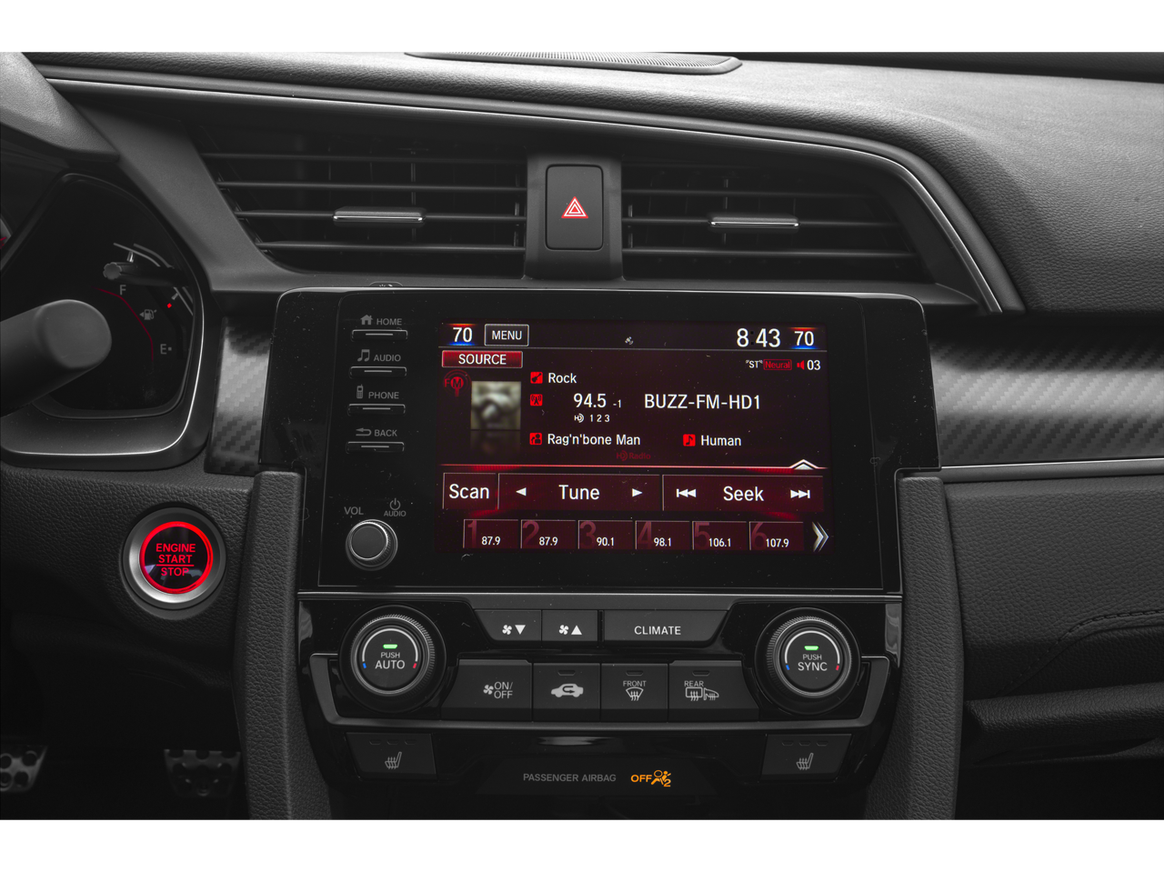 - Radio: 450-Watt AM/FM/HD/SiriusXM Audio System -inc: 10 premium speakers including subwoofer, 7-inch display audio w/high-resolution electrostatic touch-screen, knob and hard keys for primary controls and customizable feature settings, HondaLink, Apple CarPlay integration, Android Auto integration, Bluetooth® HandsFreeLink, Bluetooth® streaming audio, SMS text message function, radio data system (RDS), speed-sensitive volume compensation (SVC), 1.0-amp USB audio interface port in center console, 1.5-amp USB smartphone/audio interface port in front console, illuminated steering wheel-mounted audio controls and fin-type roof-mounted antenna